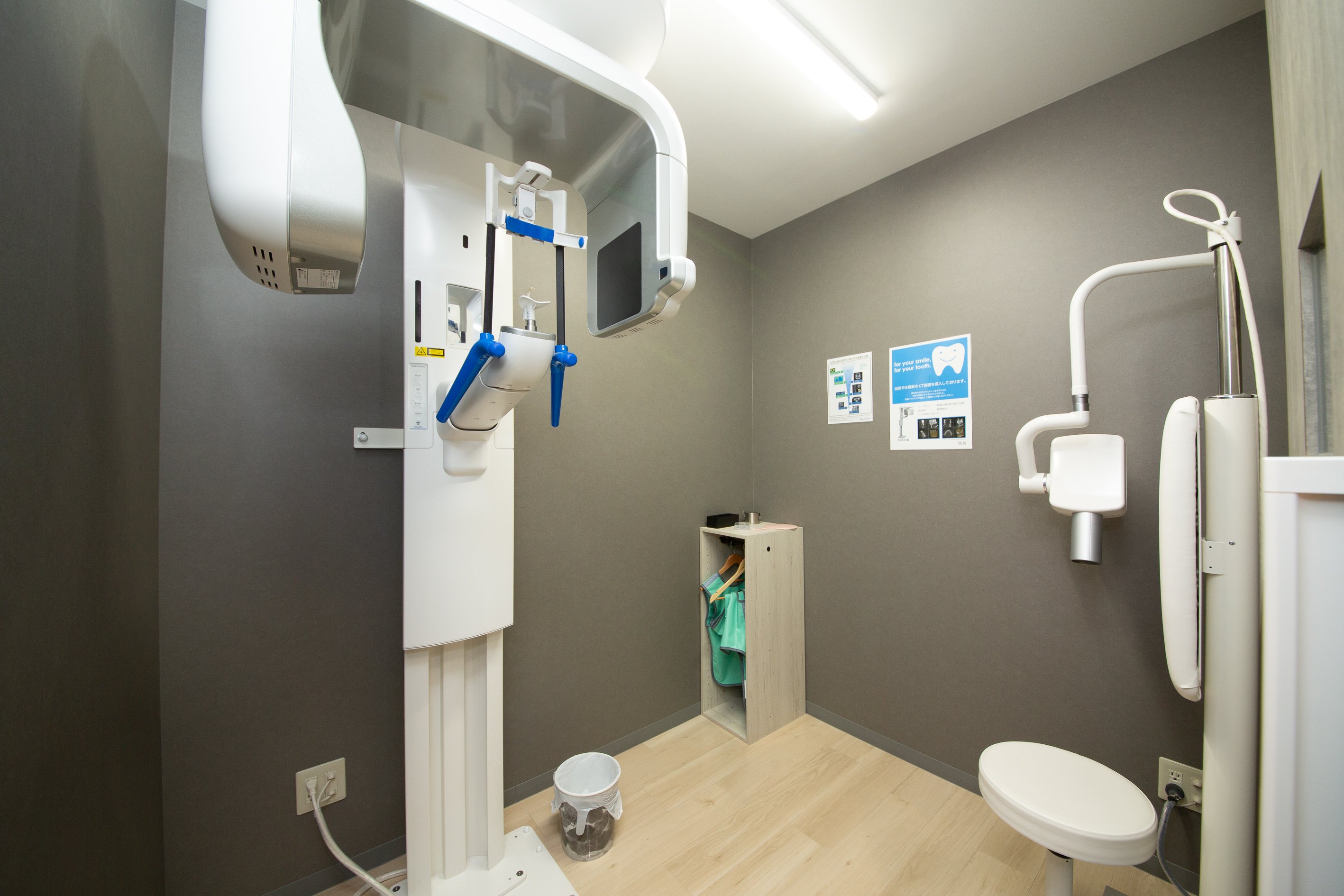お口全体を一度に撮影するレントゲン装置です。歯並びや骨の状態、親知らずの位置などを把握する際に使用されます。