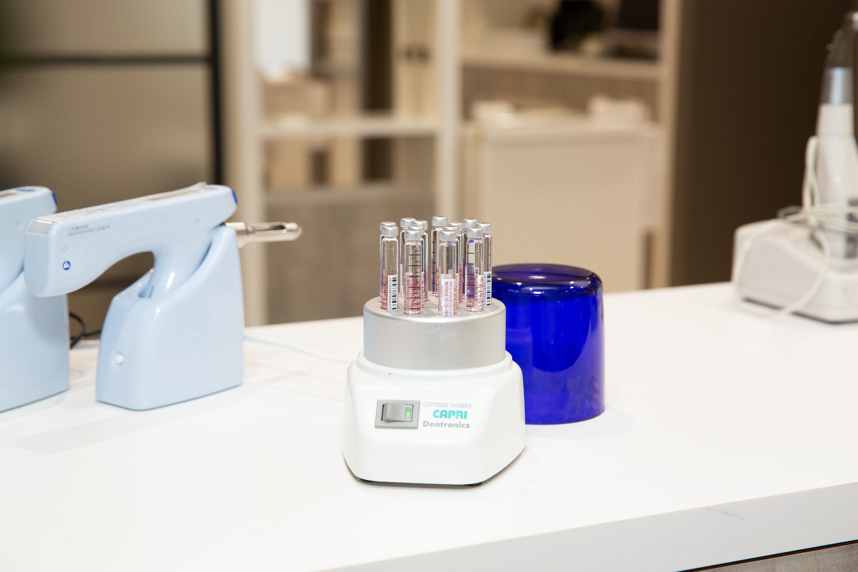 麻酔液を体温に近い温度に保つ装置です。冷たい麻酔液を使うと注入時に不快感につながる場合があり、あらかじめ温めることで違和感をやわらげやすくなります。
