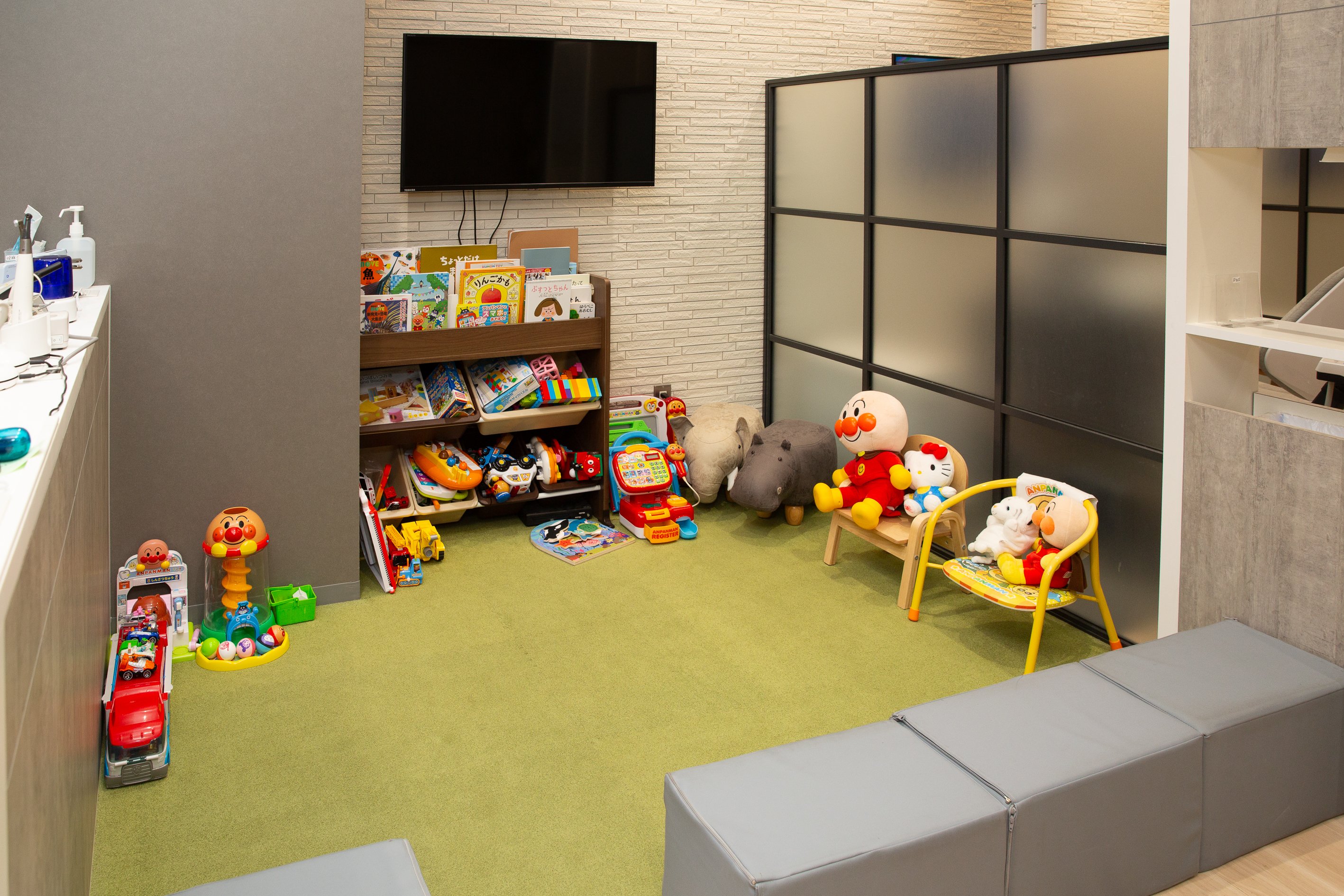 待ち時間をお子さんが過ごしやすいよう、絵本や遊具を備えたスペースです。保護者の方も見守りやすい環境になっています。